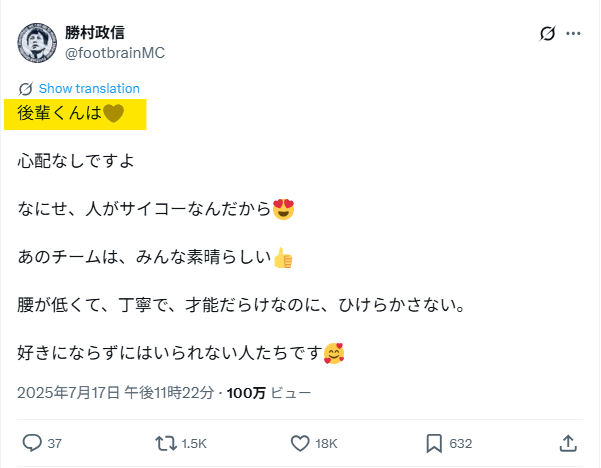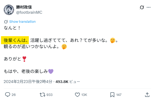 勝村政信さんは自身のXアカウントで、たびたび「後輩くん」という表現を使って若手俳優について言及しています。