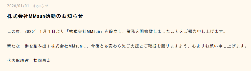 「株式会社MMsun(エムエムサン)」は2026年1月1日に設立され、松岡昌弘さんが代表取締役を務めています。