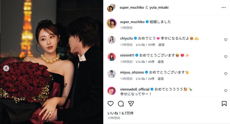 ORICONは、てんちむさんが「結婚しました」という言葉とともに輝く指輪をつけた手元の写真を公開したと報じていますが、ブランド名も価格もいっさい触れられていません。